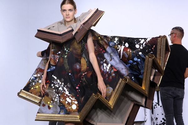 프랑스 파리에서 8일 열린 오트쿠튀르 패션쇼에서 한 모델이 그림 그리는 캔버스풍의 의상을 선보이고 있다.