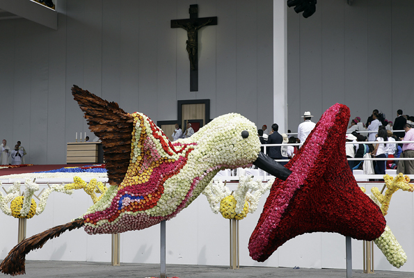 스페인 바르셀로나에서 지난 주말 열린 패션쇼에서 한모델이 수영복을 입고 캣 워킹하며 키스를 하고 있다.
