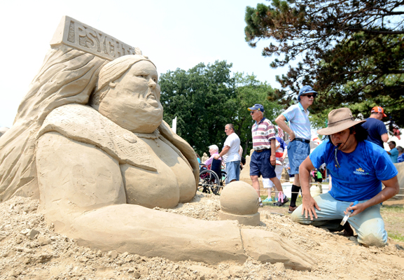 미시간 포트 허론에서 열린 ‘블루워터 샌드페스트’ 마지막 날 텍사스 오스틴의 앨버트 루시오 주니어가 멋진 모래조각품을 만들고 있다.