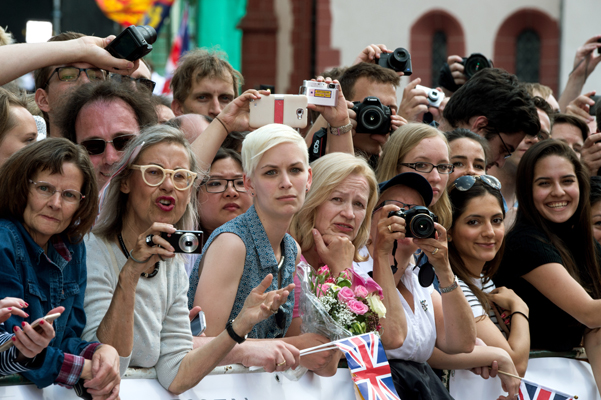 25일 독일 프랑크푸르트의 롬머 타운홀 앞에서 시민들이 독일을 방문 중인 엘리자베스 영국 여왕을 보기 위해 기다리고 있다.
