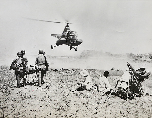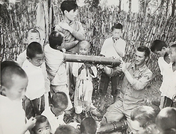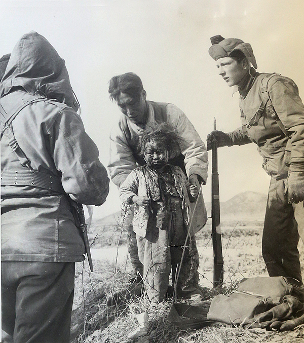 1950년 10월11일, 남한의 한 피난촌 어린이들이 미 해병대원이 보여주는 로켓포를 천진난만한 표정으로 바라보고 있다.