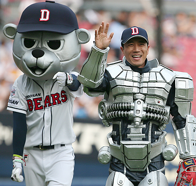 19일 서울 잠실야구장에서 열린 프로야구 롯데자이언츠 대 두산베어스의 경기 시작 전 '로봇 연기'의 대명사 장수완이 시구를 마친 뒤 관중들에게 손을 흔들고 있다. 2015.6.19