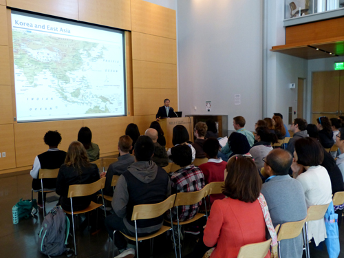 한동만 총영사는 16일 오전 11시 오클랜드 소재 미들버리 랭귀지스쿨(Middlebury Language Schools) 학생들을 대상으로 한국 정치, 경제, 사회, 한류 등을 주제로 강연했다. 이날 한국어를 배우는 학생 40여명이 한 총영사의 강연을 경청하며 한국에 대한 이해도를 높였다.