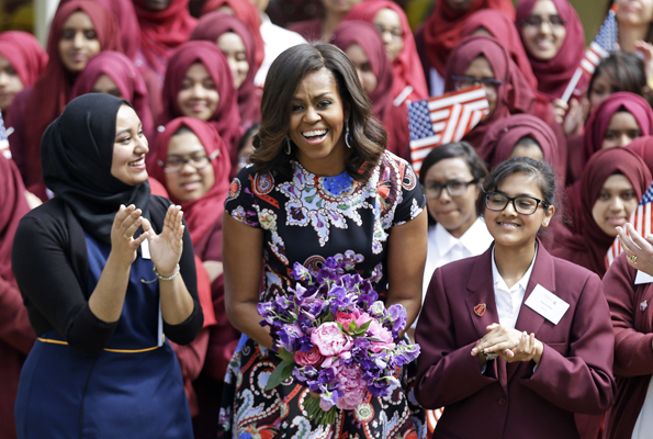 영국을 방문 중인 미셸 오바마 여사가 16일 런던의 물베리 스쿨에서 학생들과 교사들의 환영을 받고 있다. 미셸은 여성교육 장려 차런던을 방문 중이다.