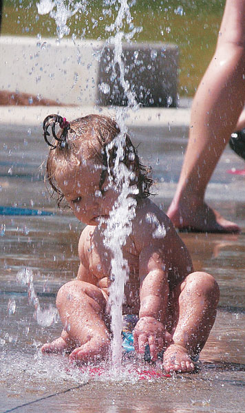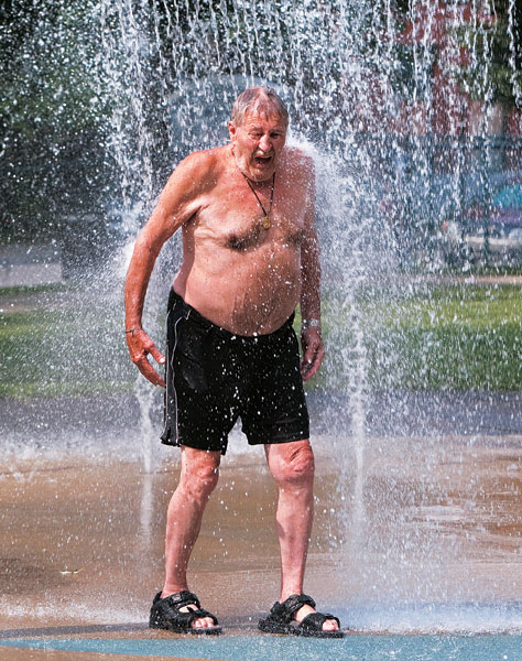 몬트리얼 공원에서 29일 이름이 애드리언 벨플루인 지역 주민이 분수에서 더위를 식히며 81세 생일을 자축하고 있다.