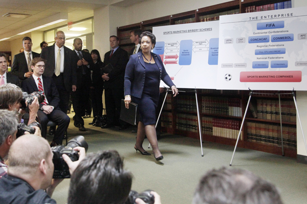 미 법무부가 국제축구연맹(FIFA) 뇌물스캔들에 연루된 FIFA 전현직 간부와 주변인 등 14명에 대한 기소 방침을 밝힌 가운데 27일 로레타 린치 미 법무장관이 기자회견장에 들어오고 있다.