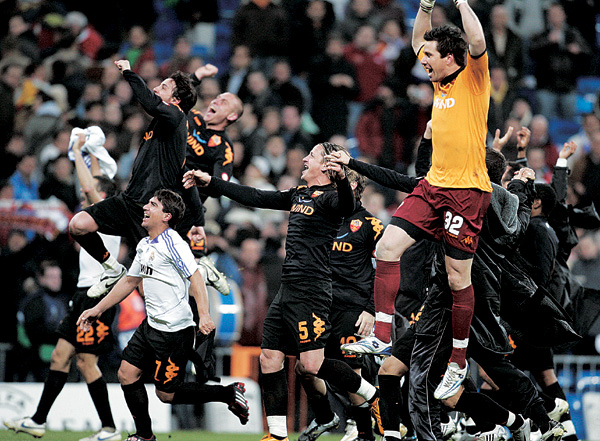 적지에서 레알 마드리드를 꺾고 8강에 오른 AS 로마선수들이 경기 종료 휘슬이 울리자 환호하고 있다.
