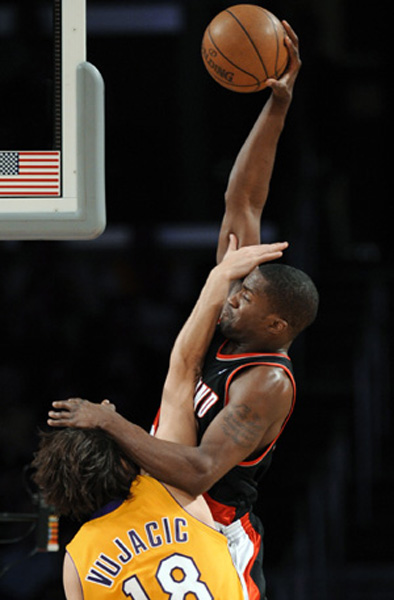 레이커스 가드 사샤 부야치츠(18번)가 트레일 블레이저스 마텔 웹스터의 덩크를 막는데 실패하고 있다.