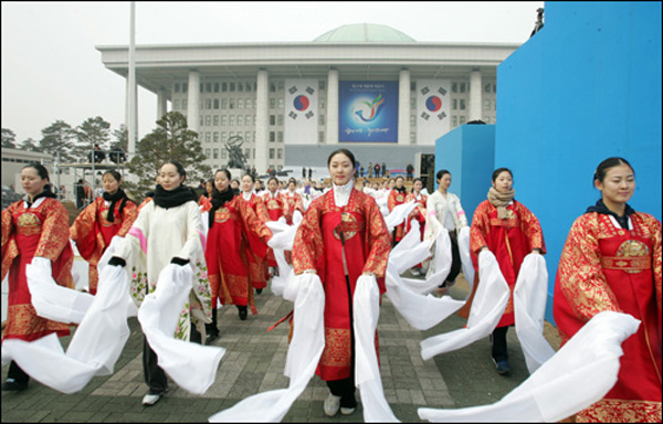 이명박 대통령 당선인의 취임식을 앞두고 22일 국회 본관 앞에서 연합무용단이 한창 예행 연습 중이다. (서울=연합뉴스)