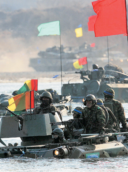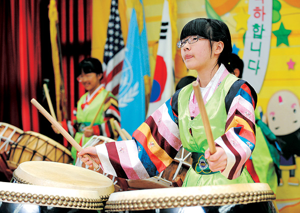 판문점 민간인 통제선 안쪽에 자리 잡은 대성동 초등학교 졸업식에서 한복을 곱게 차려 입은 학생들이 꽹과리와 북을 치고 있다.