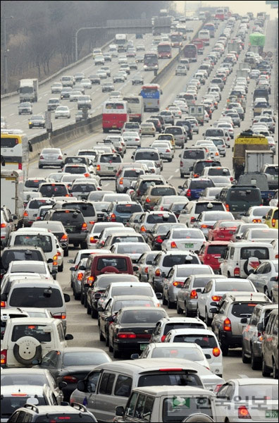 한국 설 명절 민족 대이동이 시작됐다. 설 연휴를 하루 앞둔 5일 고향으로 향하는 차량들이 긴 행렬을 이루며 경부고속도로 서울요금소를 빠져나가고 있다. 이날 하루 동안에만 총 38만여대의 차량이 서울을 떠났다. 원유헌기자