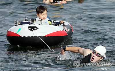 배우 송일국과 아들 대한이 17일 오전 인천시 연수구 송도센트럴공원에서 열린 '제3회 국민안전처 장관배 전국 트라이애슬론 대회'에서 힘차게 물길을 질주하고 있다. 2015.5.17