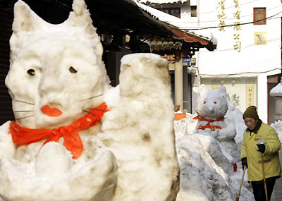 3일(현지시간) 중국의 남경 골목에서 가지 각색의 눈사람이 만들어져 있다.(AP=연합)