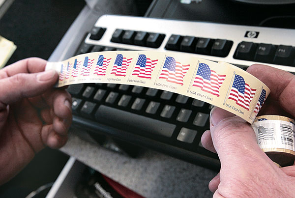 많은 소비자들이 최근 각종 페이먼트를 온라인으로 보내는 사례가 급증함에 따라 연방 우정국은 고객들에 대한 전자 서비스를 확대하고 있다. 캘리포니아주 글렌데일에서 개인 소포 배달업체를 운영하고 있는 한 업주가 100장짜리 우표 한 묶음을 펼쳐 보이고 있다.