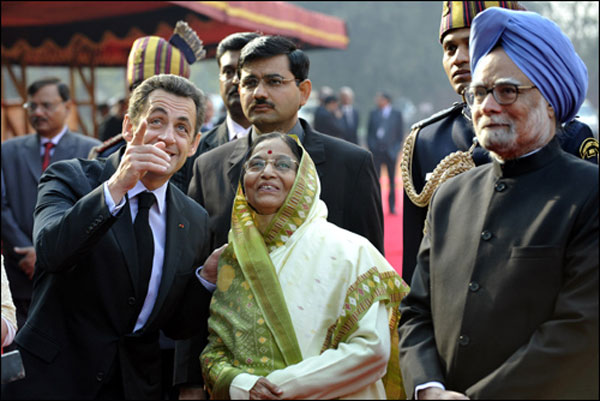 인도를 방문중인 프랑스의 니콜라 사르코지(왼쪽) 대통령이 25일 뉴델리의 대통령궁에서 프라티바 파틸(가운데) 인도 대통령, 만모한 싱 총리등과 함께 이야기하고 있다. (AP=연합)