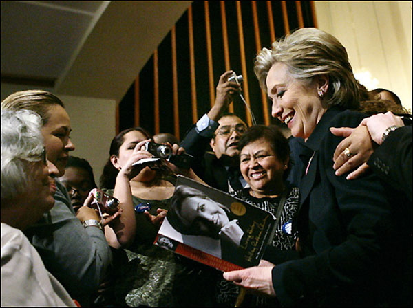 민주당 대선주자인 힐러리 클린턴 상원의원이 17일 캘리포니아 콤프턴의 침례교회에서 선거 유세를 한 뒤 지지자들에게 둘러싸여 자신이 쓴 책에 사인을 해주고 있다.(AP=연합)