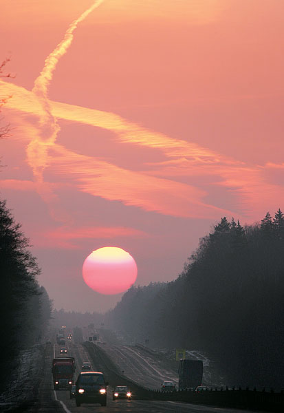 벨로루시 공화국 수도 민스크 고속도로 선상에 석양이 붉게 물들어 있다.