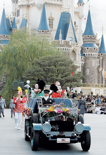 일본 도쿄의 디즈니랜드에서 열린 신년 퍼레이드에서 미키와 미니 마우스가 차량에 탄 채 행진을 벌이고 있다.