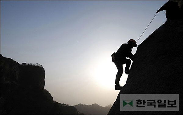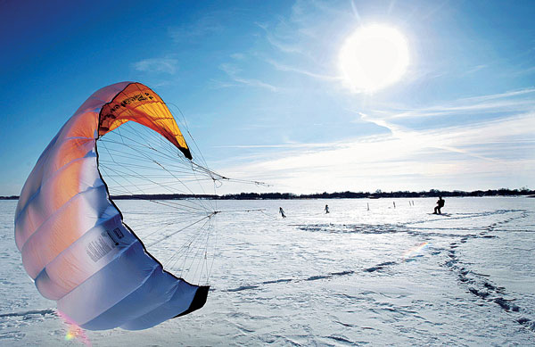 위스콘신주 매디슨의 10대 소년이 눈과 얼음으로 덮인 레익 모노나에서 파워 카이팅 을 즐기고 있다. 파워 카이팅은 스키신발을 착용한 채 100피트짜리 케이블에 연결된 대형 연이 바람을 받아 당기는 힘으로 빙판을 질주하는 게임이다.