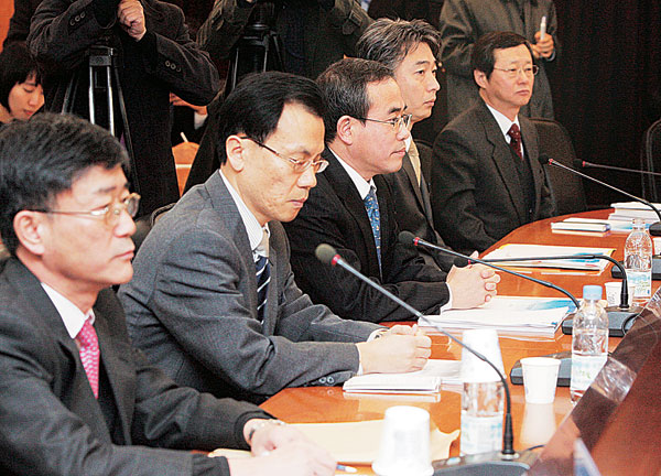 국정홍보처 폐지설이 흘러나오고 있는 가운데 3일(한국시간) 서울 삼청동 경남대 극동문제연구소에서 열린 대통령직 인수위원회 국정홍보처 업무보고에서 국정홍보처 관계자들이 굳은 표정으로 업무보고를 하고 있다. 사진 왼쪽부터 이칠화 혁신기획관, 김희범 정책홍보관리실장, 서강수 콘텐츠운영단장, 조신 홍보관리관, 김진호 KTV 방송제작기획관.