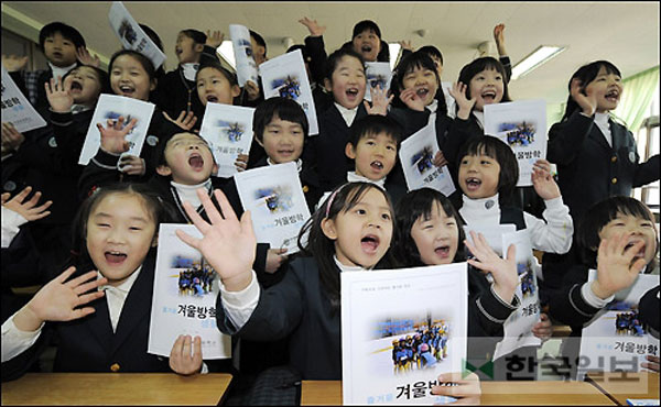 18일 서울 은평구 은혜초등학교 어린이들이 겨울방학생활 책을 들고 환성을 지르며 즐거워하고 있다. 이날 은혜초등학교 등 3개 학교를 시작으로 서울 시내 대부분의 초등학교가 이번 주 겨울방학에 들어간다. 김주성기자 poem@hk.co.kr