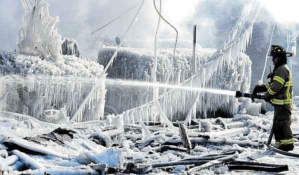 울 폭풍이 미 동부지역을 강타한 가운데 매서추세츠 글루세스터에서 발생한 4층짜리 아파트 화재현장이 소방관들의 뿌리 방화수로 온통 고드름이 맺혀 있다. 이번 겨울폭풍으로 수십만 가구가 정전으로 불편을 겪고, 수명이 사망하는 등 피해가 늘고 있다.