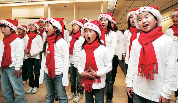 한국 청소년 예술단(단장 서지혜) 학생들이 크리스마스를 앞두고 13일 할리웃 장로병원을 방문, 입원중인 환자들에게 캐롤을 불러주며 위로했다. 어린 학생들이 귀여운 모습으로 노래를 부르고 있다.
