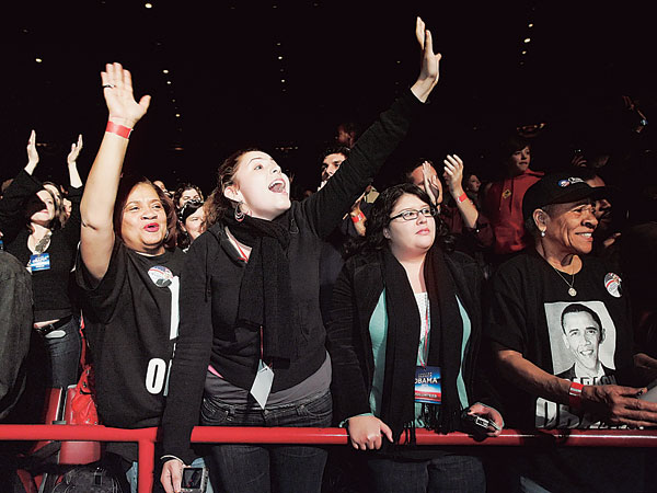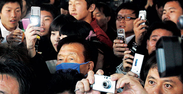 한국의 대선 투표일이 불과 5일 앞으로 다가온 가운데 유세장에 나온 유권자들의 표심은 진지하기만 하다. 한국시간 12일 한 유세장에서 시민들이 휴대폰으로 후보자의 연설을 촬영하고 있다.