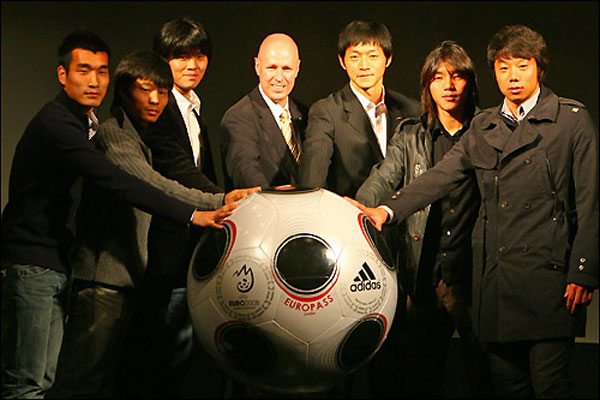 3일 오전 서울 밀레니엄 힐튼호텔에서 열린 아디다스 유로 2008 공인구 유로패스 공개행사에서 폴 하디스티 아디다스 코리아 사장을 비롯한 아디다스 후원 축구 선수들이 대형 유로패스에 손을 언져 취재진을 향해 포즈를 취하고 있다. (왼쪽부터) 조원희, 최성국, 김영광, 하디스티 사장, 김남일, 김치우, 염기훈. (서울=연합뉴스)