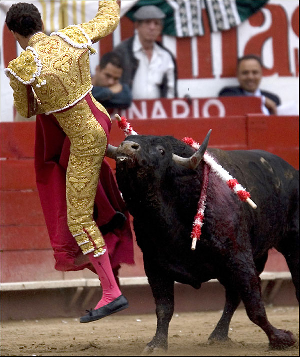 18일(현지시각) 맥시코에서 열린 투우쇼에서 스페인 출신의 한 투우사가 투우에게 맹렬한 공격(?)을 당하고 있다.(AP=연합)
