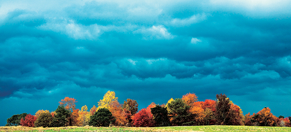 앨라배마 에디슨 인근의 한 언덕 꼭대기에서 잔뜩 낀 먹구름이 단풍으로 물든 주변 경관과 멋진 색의 조화를 이루고 있다.