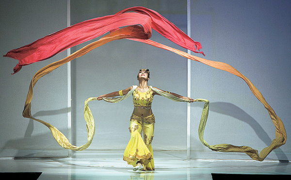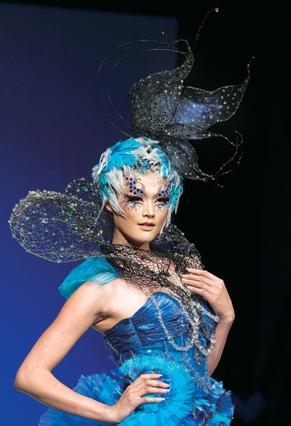 중국 베이징에서 열린 화려한 의상 경연대회 출품작을 요란스런 눈 화장을 한 모델이 선보이고 있다.