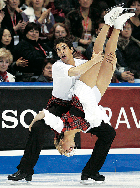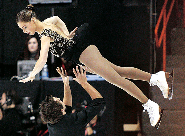 캐나다 퀘벡시티에서 열린 스케이트 캐나다 국제 피겨 스케이팅 에서 프랑스의 퍼넬 캐론이 여성 파트너를 거꾸로 들어 올리는 멋진 모습을 연출하고 있다.