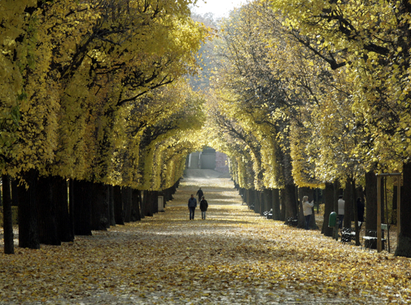 낙엽이 융단처럼 깔린 오스트리아 셰부룬 캐슬 공원에 산책객들이 가을의 정취를 만끽하고 있다.