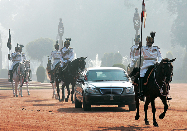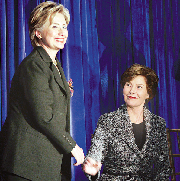 민주당의 유력 대선 예비후보 힐러리 클린턴 상원의원(왼쪽)이 지난달 31일 워싱턴의 스월-벨몬트 하우스 앤 뮤지엄에서 로라 부시 여사를 향해 손을 내밀고 있다. 이날 여야 의원들과 관계자들은 역사보존 법안을 제정할 것이라고 발표했다.