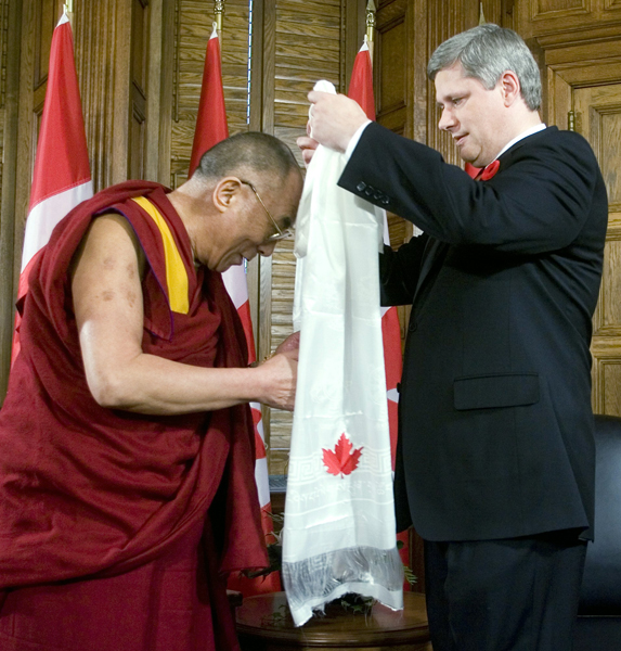 스티븐 하퍼 캐나다 총리가 29일 오타와 의사당에서 티벳 지도자 달라이 라마에게 캐나다 표장 단풍나무 잎이 새겨진 카타를 선물하고 있다.