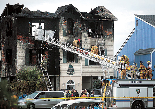 28일 새벽 노스캐롤라이나의 오션 아일 비치의 한 주택에서 화재가 발생, 6명이 숨지고 수명이 부상당한 사고가 발생했다. 화재 당시 이 집에는 대학생 10여명이 묵고 있었다. 한 희생자의 시신을 소방대원들이 운반해 나오고 있다.