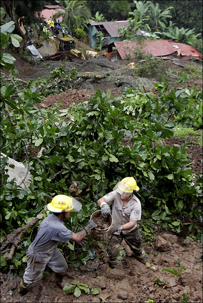 11일(현지시각) 코스타리카 산사태사고현장에서 생존자 수색작업을 펴고있는 코스타리카 적십자사 대원들의 모습(AP=연합)