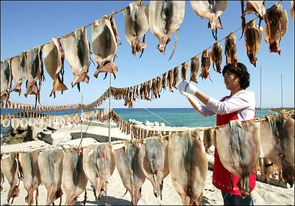 오징어가 잡히지 않는데다 궂은 날씨까지 계속됐던 강원도 강릉지방에 5일 모처럼 쾌청한 가을날씨를 보이자 바닷가에서 오징어를 말리는 주민들의 풍경이 여유롭다.(강릉=연합뉴스)