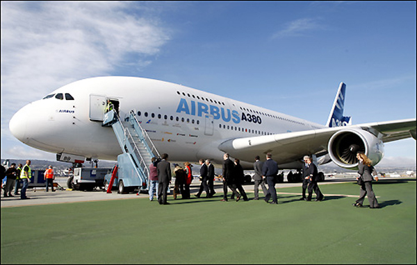 4일(현지시각) 미국 샌프란시스코 국제 공항에서 2층으로 이루어진 세계에서 가장 큰 항공기인 에어버스 A380 시험 비행기에 사람들이 탑승하고있다.(AP=연합)