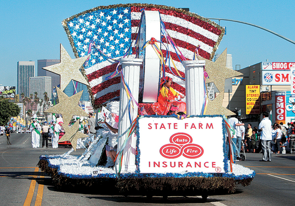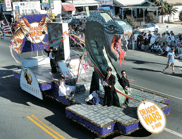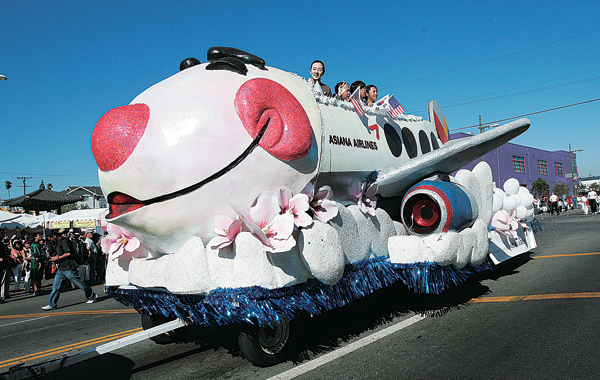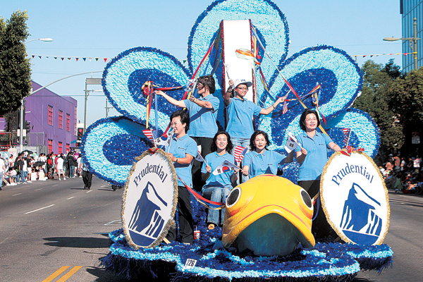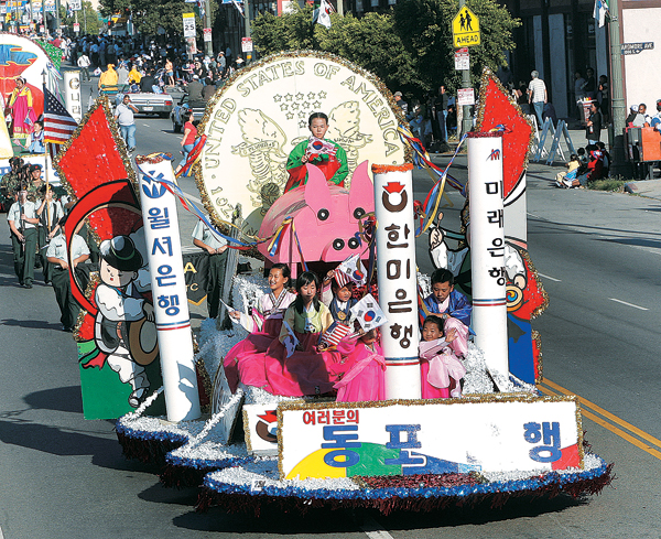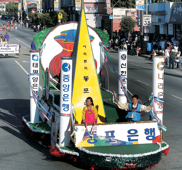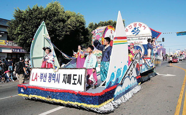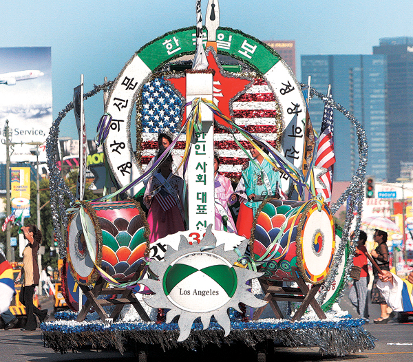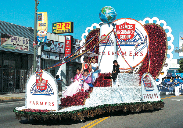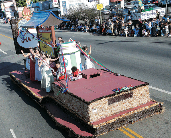코리안 퍼레이드의 주관처인 한국일보 미주본사 꽃차가 화려하게 단장돼 올림픽가를 지나고 있다.