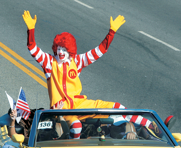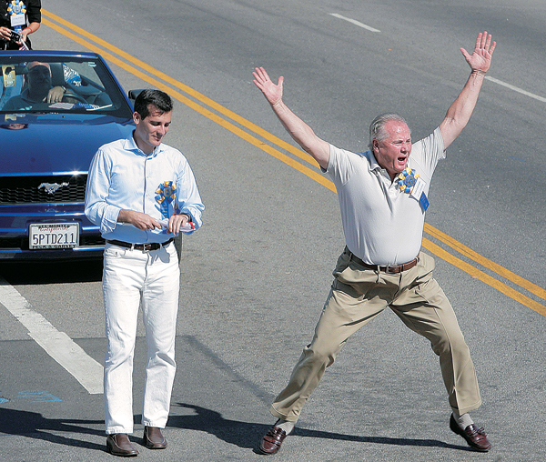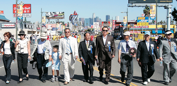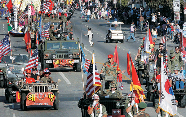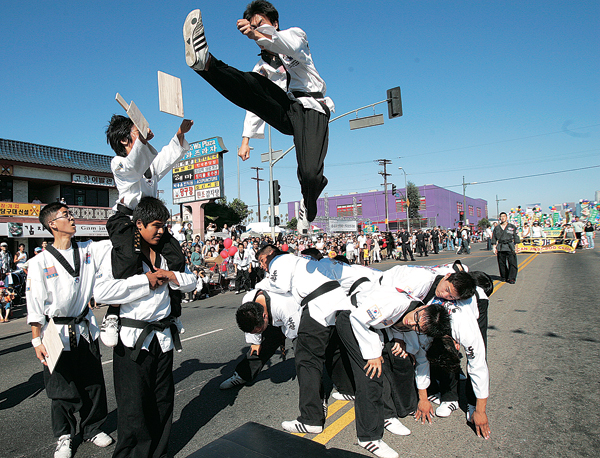 퍼레이드 참가팀중 가장 많은 인기를 끈 태권도 시범단 소속 한 한인청년이 엎드린 동료들의 위로 점프하며 고난도의 송판격파 시범을 보이고 있다.