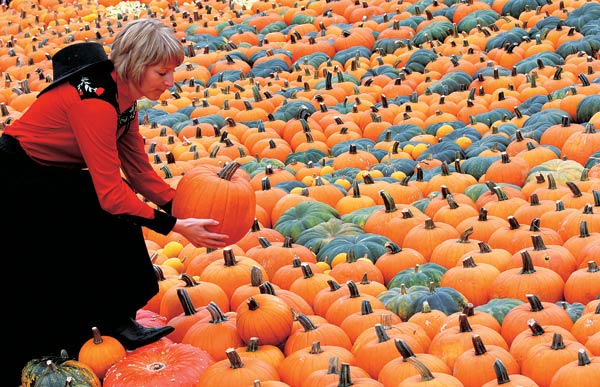 독일 베를린 남쪽 외곽지역인 클라스로의 한 호박 농장에서 종업원인 클라우디아 미코슈가 전시된 호박을 들어보고 있다. 이 농장은 1만개의 호박을 전시하고 있다.