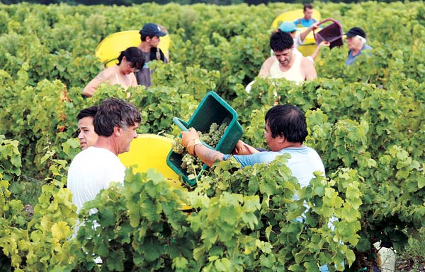 프랑스 까도작 인근 포도원에서 28일 계절노동자들이 백포도를 수확하고 있다. 2007년도 보르도 백포도주의 포도 수확이 이날부터 처음 시작됐다.