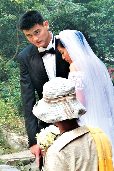 중국 농구스타 야오 밍이 지난 31일 항조우에서 약혼녀 예 리와 결혼사진을 찍고 있다. 야오 밍과 예 리는 6일 상하이에서 100명의 친지들과 거의 같은 수의 경호원들이 참석한 가운데 결혼식을 치렀다.