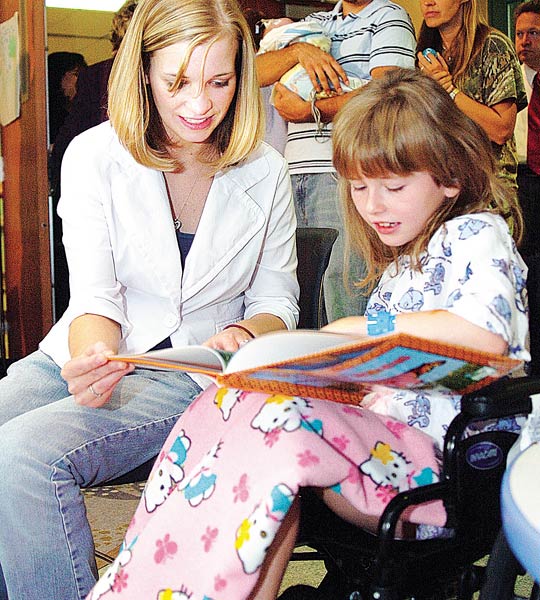 이라크군에 포로로 잡혔던 제시카 린치가 25일 웨스트 버지니아 대학 아동병원에서 환자 홀리 엘더와 함께 책을 읽고 있다. 린치는 어린이 환자들을 위해 인형을 모아 기부하는 프로그램 제시즈 팔을 시작할 계획을 밝혔다.