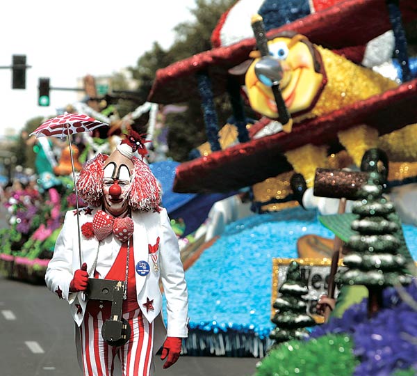 유타주 솔트레익 시티에서 24일 열린 Days of 47 퍼레이드 행사도중 한 광대가 꽃차 앞을 지나가고 있다. 이 퍼레이드는 1847년 몰몬교 선구자들의 솔트레익 도착을 기념하는 행사다.
