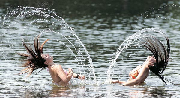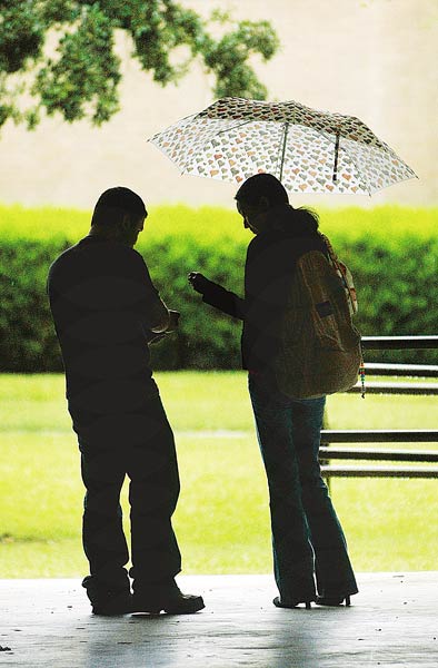 텍사스주 할리전 소재 테크니컬 칼리지의 남녀 재학생 두 명이 17일 빗속에서 다음 수업시간표를 들여다보고 있다. 텍사스는 이번 주 내내 비가 내릴 것으로 예상된다.