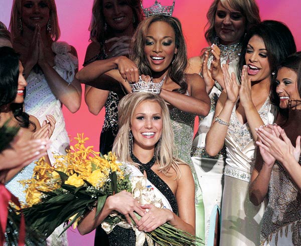 7일 텍사스주 포트워스에서 열린 미스 텍사스 선발대회에서 최고 미인으로 뽑힌 몰리 해즐렛이 왕관을 쓰고 있다.