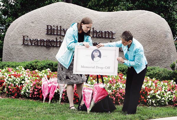 빌리 그레이엄 복음협회 직원인 멜리사 로빈슨(오른쪽)과 로라 코크란(왼쪽)이 15일 노스캐롤라이나 샬럿 소재 빌리 그레이엄 도서관 입구에 루스 그레이엄을 추모하는 사인판을 설치하고 있다. 그레이엄 목사의 사모인 루스는 14일 타계했다.